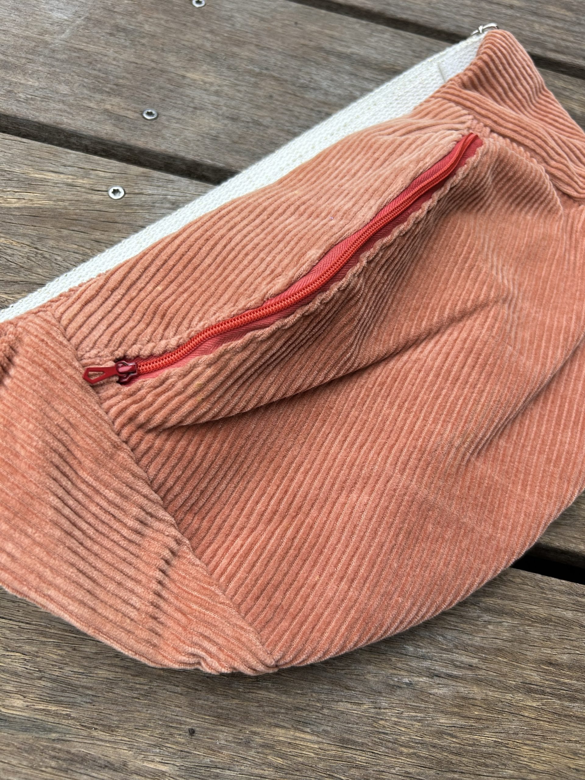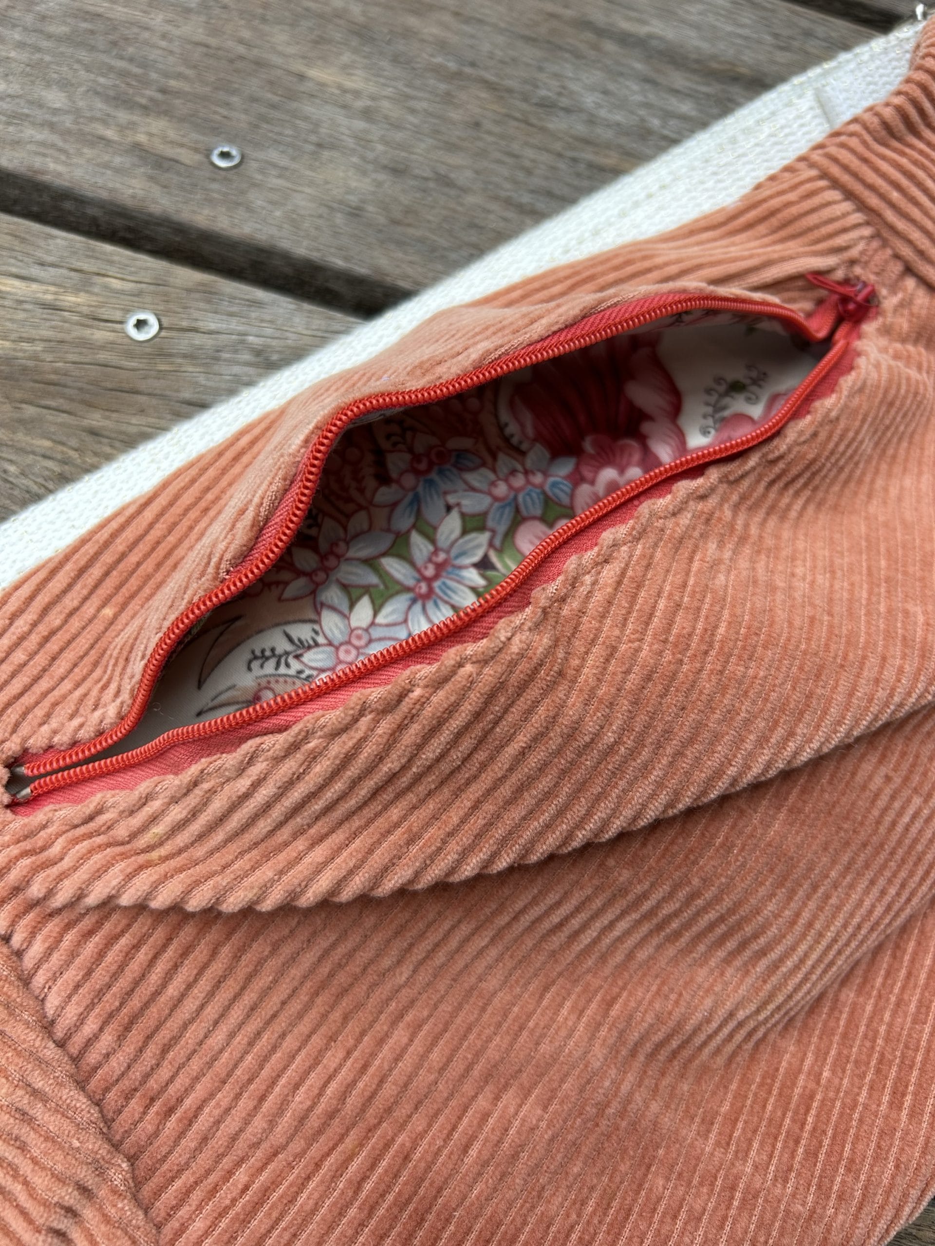 J’ai confectionné ce modèle de banane à partir d’un pantalon en velours côtelé vieux rose. Quant à la doublure, je me suis servie d’un drap aux motifs à fleurs dans les mêmes tons. Pour la fermeture éclair, j’en ai trouvé une rose juste un peu plus foncé que le velours et qui se coordonne très bien.